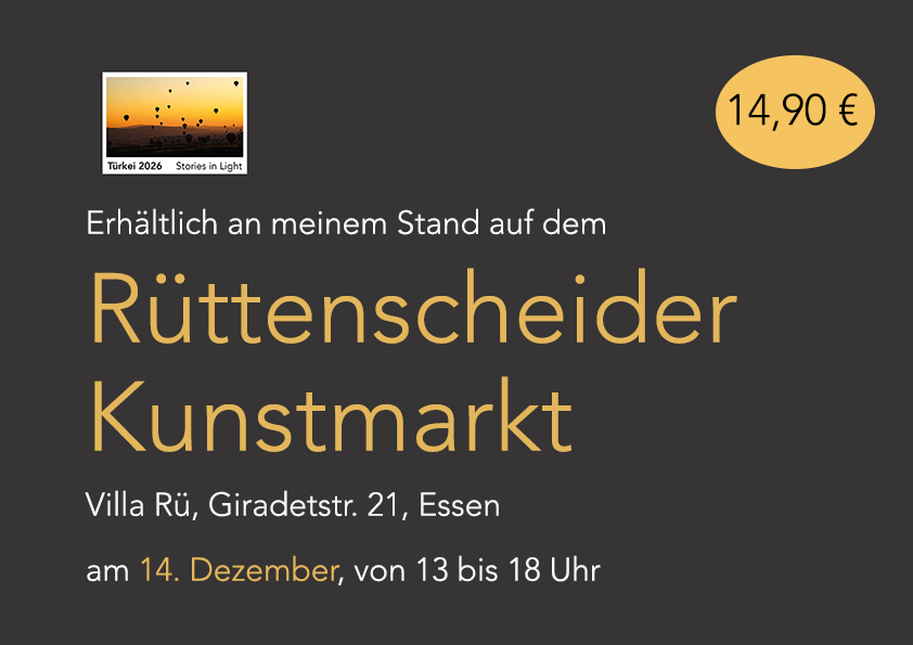 Bestelle ihn innerhalb der EU. Erwirb ihn direkt in Essen. Entweder in der Postfiliale Essen-Bredeney oder an meinem Stand auf dem Rüttenscheider Kunstmarkt in der Villa Rü am 14. Dezember von 13 bis 18 Uhr.